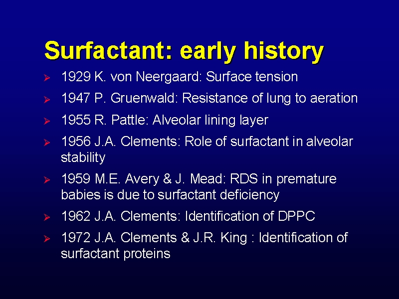 In 1972 the importance of the hydrophobic proteins was described by Clements and co-workers but successful treatment in humans did not occur until 1980. Clements J.A. Physiologist 1962