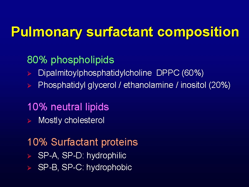 Pulmonary surfactant is a complex mixture of lipids and specific apoproteins, 80% phospholipid, 8-10% neutral lipids and 10-12% proteins. The phospholipid component consists of 60% saturated phosphatidylcholine (PC), 20% unsaturated PC and anionic phospholipids, phosphatidylglycerol (PG) and phosphatidylinosotol.