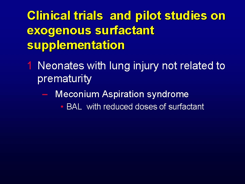 In order to remove the meconium from the lung as soon as possible , Lam et al. applied broncho-alveolar-lavage (BAL) using diluted surfactant solution (15 ml/kg of saline with 5 mg/ml of surfactant), in 6 infants affected by MAS and necessitating artificial ventilation. Oxygenation index was > 15 within 6 h of life. A large quantity of meconium was removed, due to the detergent effect of diluted surfactant, from the airway by bronchosuctioning. The portion of diluted surfactant that remained in the lung had a more homogeneous distribution which helped to enhance the surfactant system. Oxygenation index, mean airway pressure, FiO2 and a/APO2 ratio improved significantly within the first 48 h. Duration of ventilation and oxygen therapy was also significantly reduced in the treated compared with the control group.